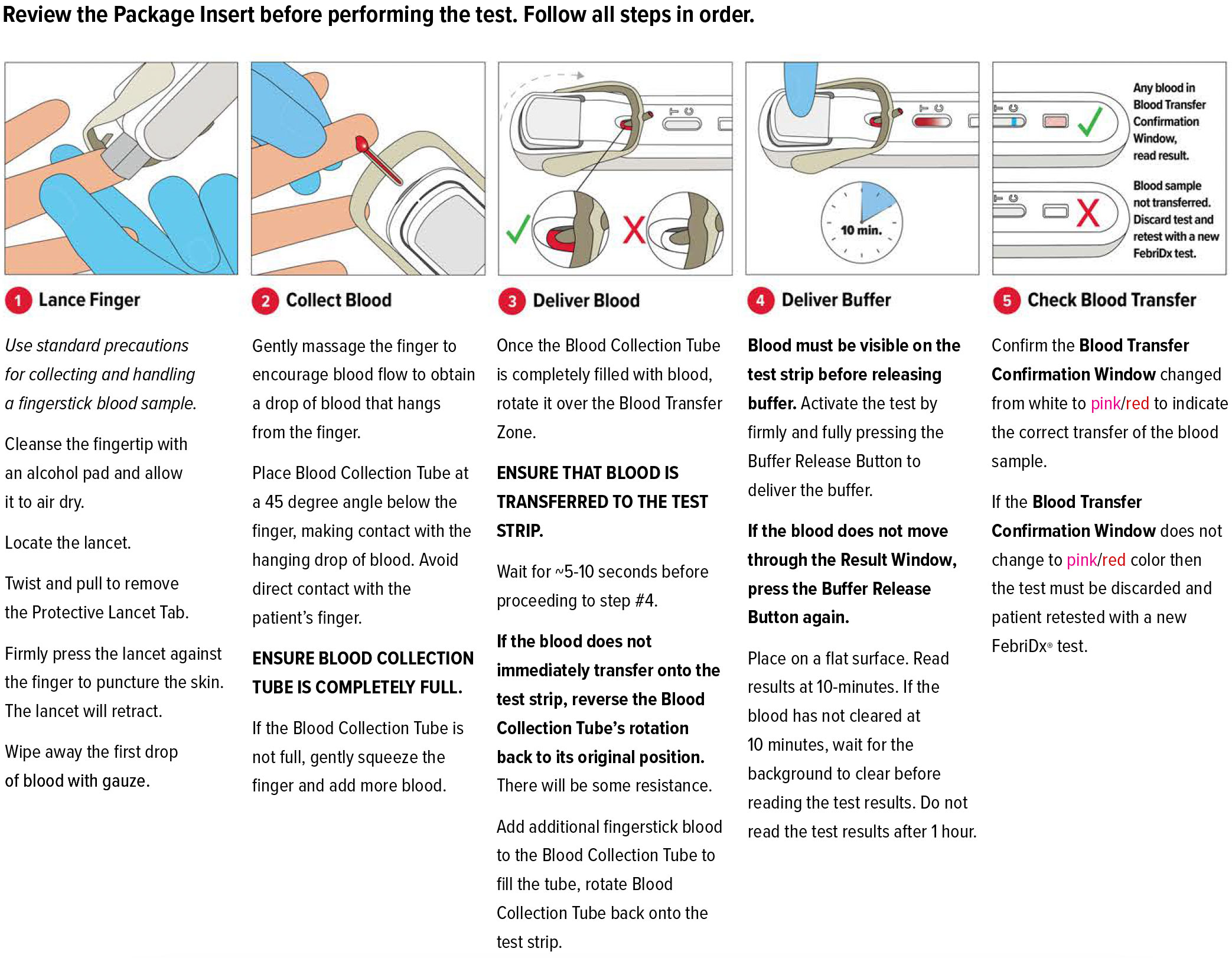 FebriDx is a rapid point-of-care test that uses a fingerstick blood sample to aid in the differentiation between bacterial and viral infection.