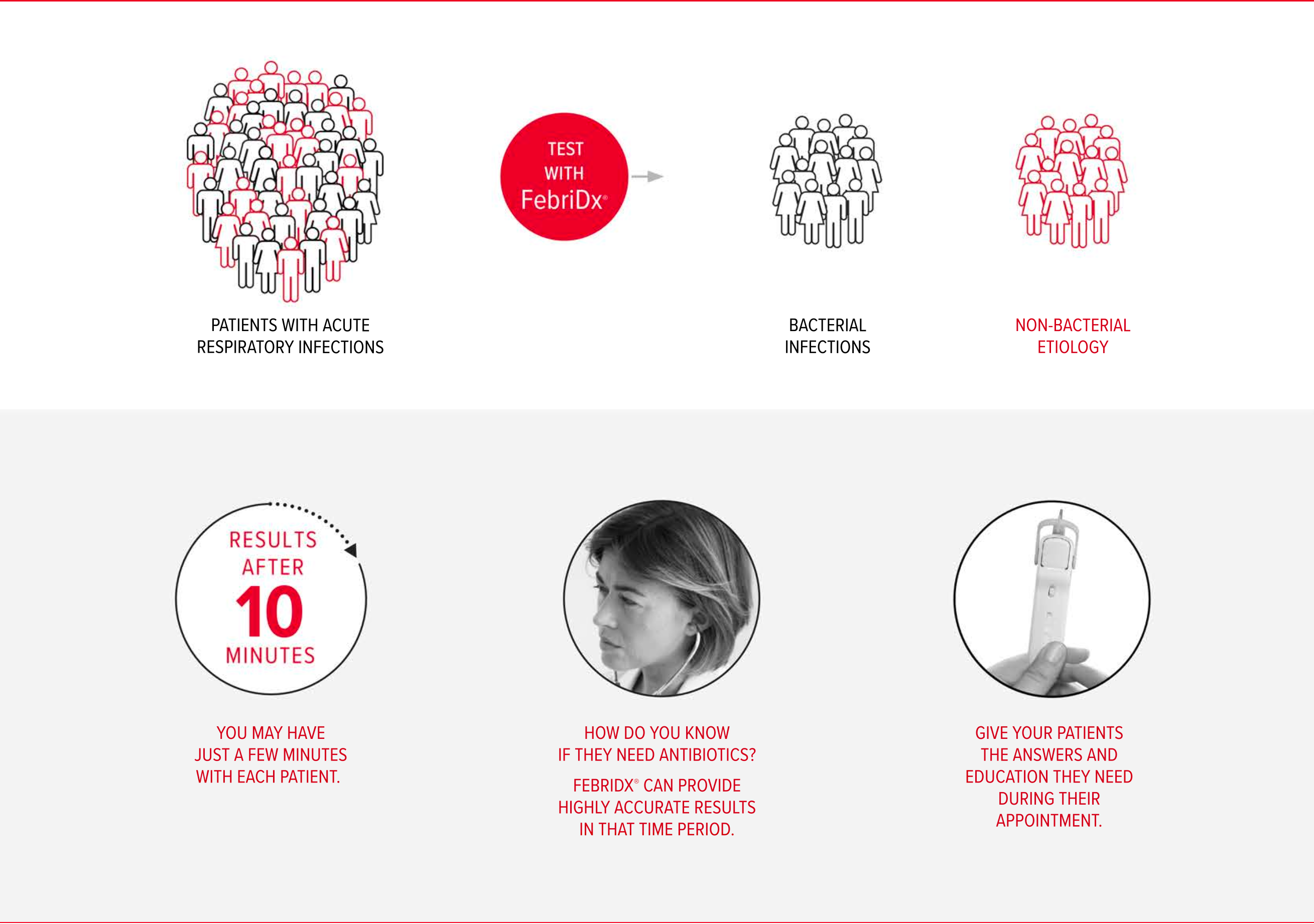 FebriDx offers rapid, point-of-care results that aid in diagnosing a bacterial infection,7,8 which could have a direct impact on the spread of resistant bacteria.